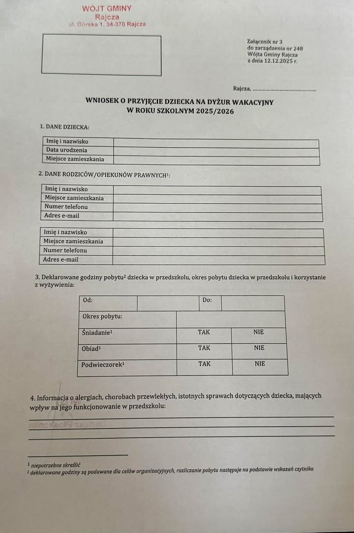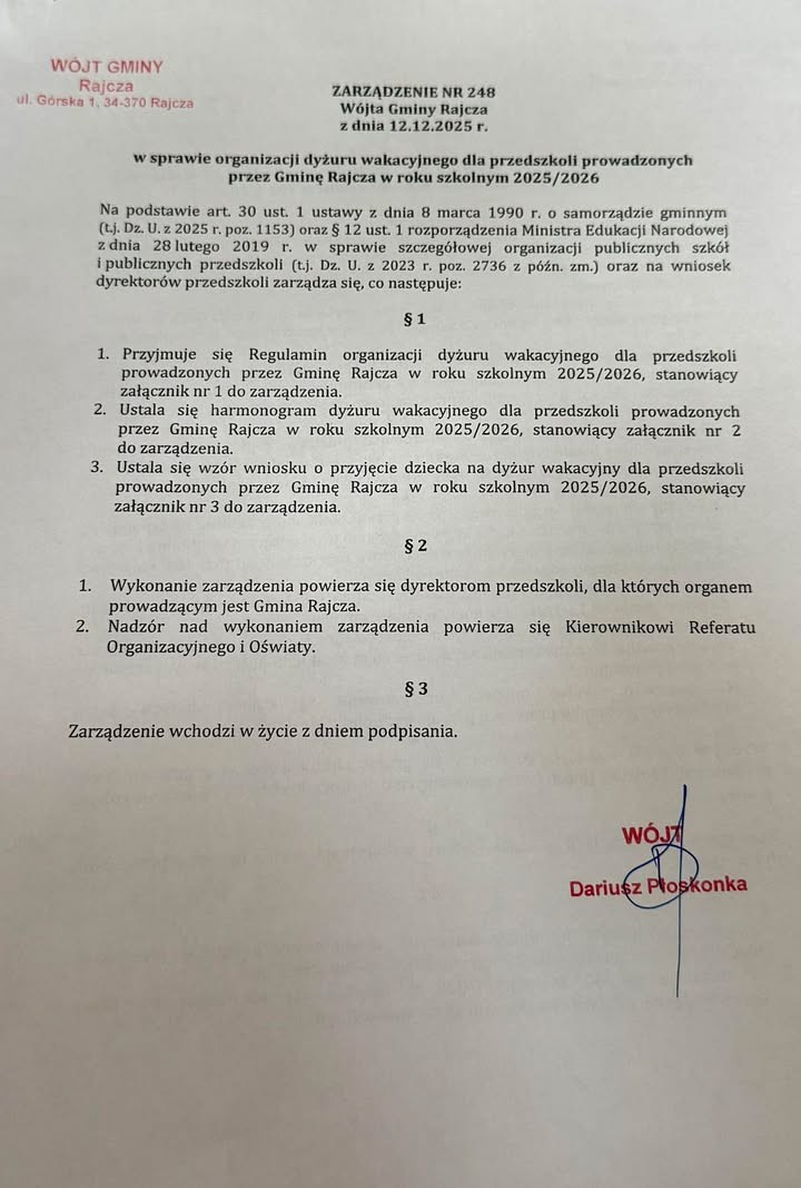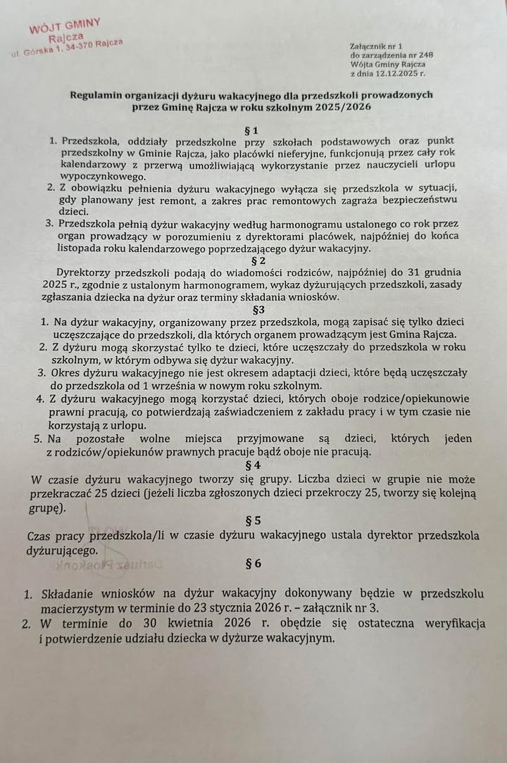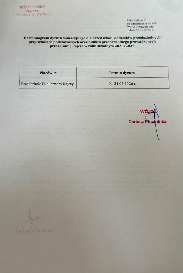Prosimy Rodziców o zapoznanie się z Zarządzeniem Wójta Gminy Rajcza oraz Regulaminem organizacji DYŻURU WAKACYJNEGO dla przedszkoli prowadzonych przez Gminę Rajcza w roku szkolnym 2025/2026!